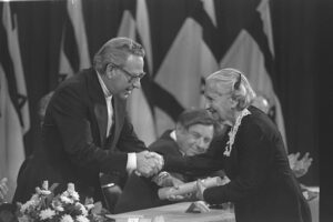 יו"ר חבר השופטים שהעניק לה את הפרס היה יצחק נבון, אז ח"כ. שנתיים אחרי כן, מיד אחרי השבעתו לנשיאות, פתח את סיורו הראשון במפגש עמה. אף ששיוכה הפוליטי היה גלוי — היא שובצה במקום סמלי (120) ברשימת המערך בבחירות 1977 — גובר היתה בראש ובראשונה אישיות ממלכתית. ב–1979 הזמין אותה ראש הממשלה מנחם בגין לקמפ דיוויד לטקס החתימה על הסכם השלום עם מצרים.